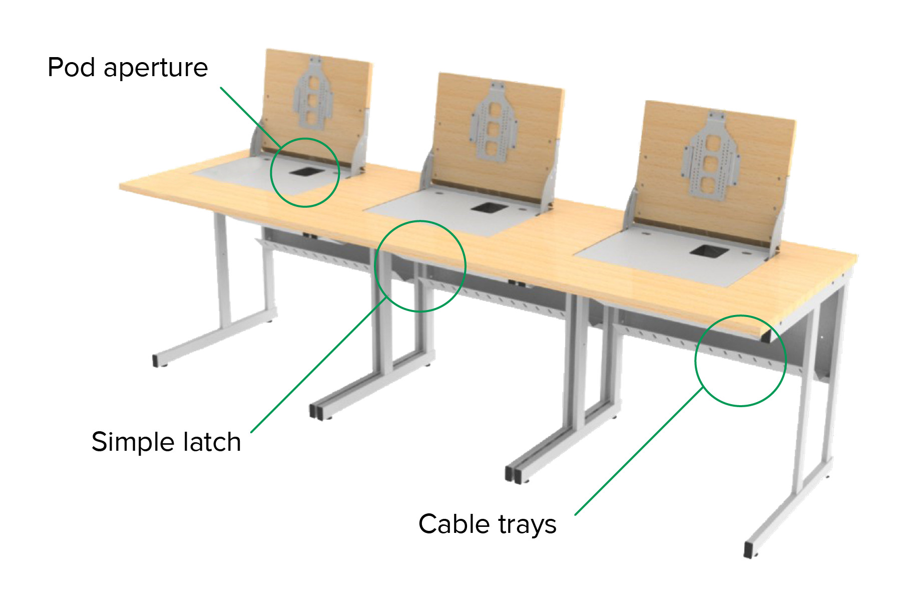 Apertures in pod to pass cables to screen keyboard and mouse + cable tray options for effective cable management