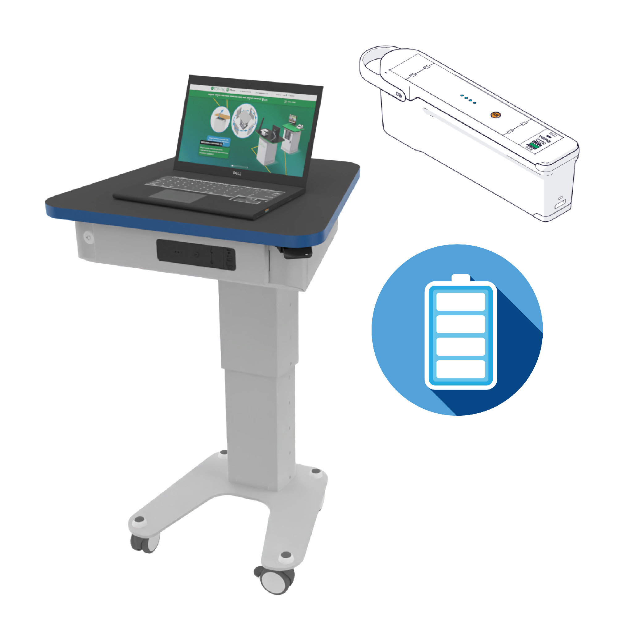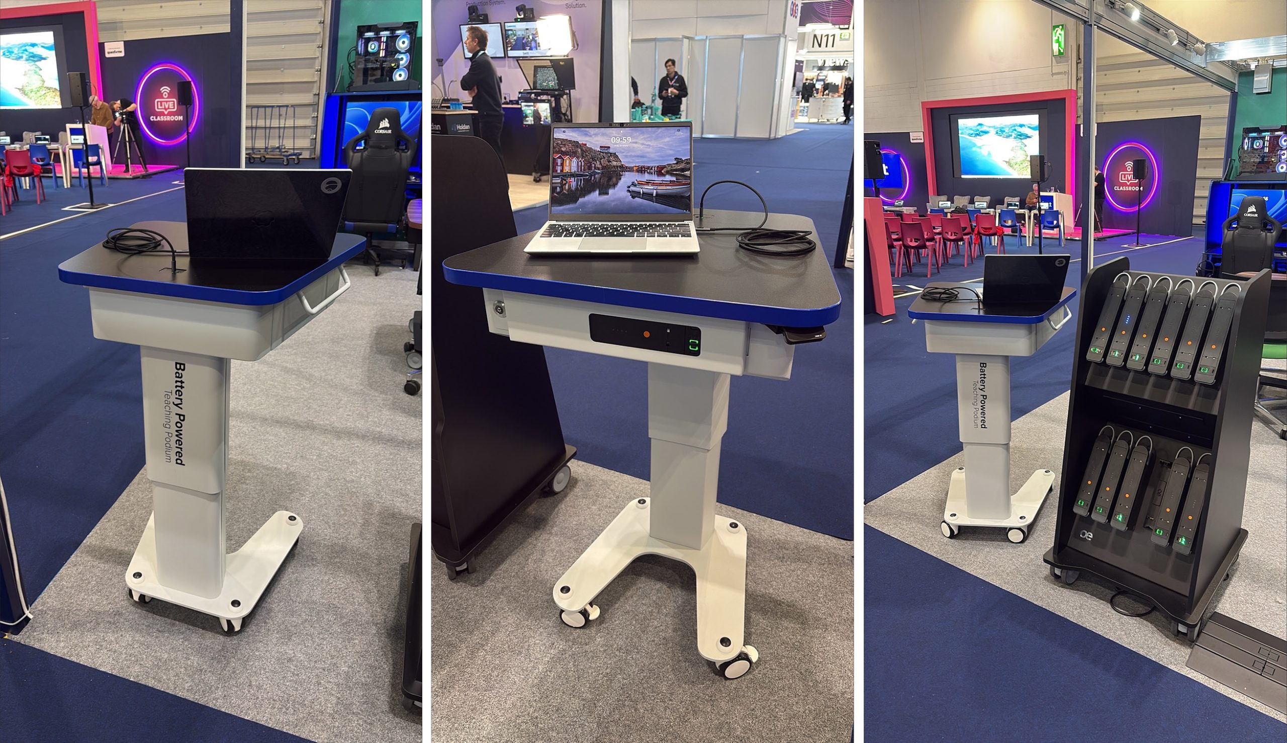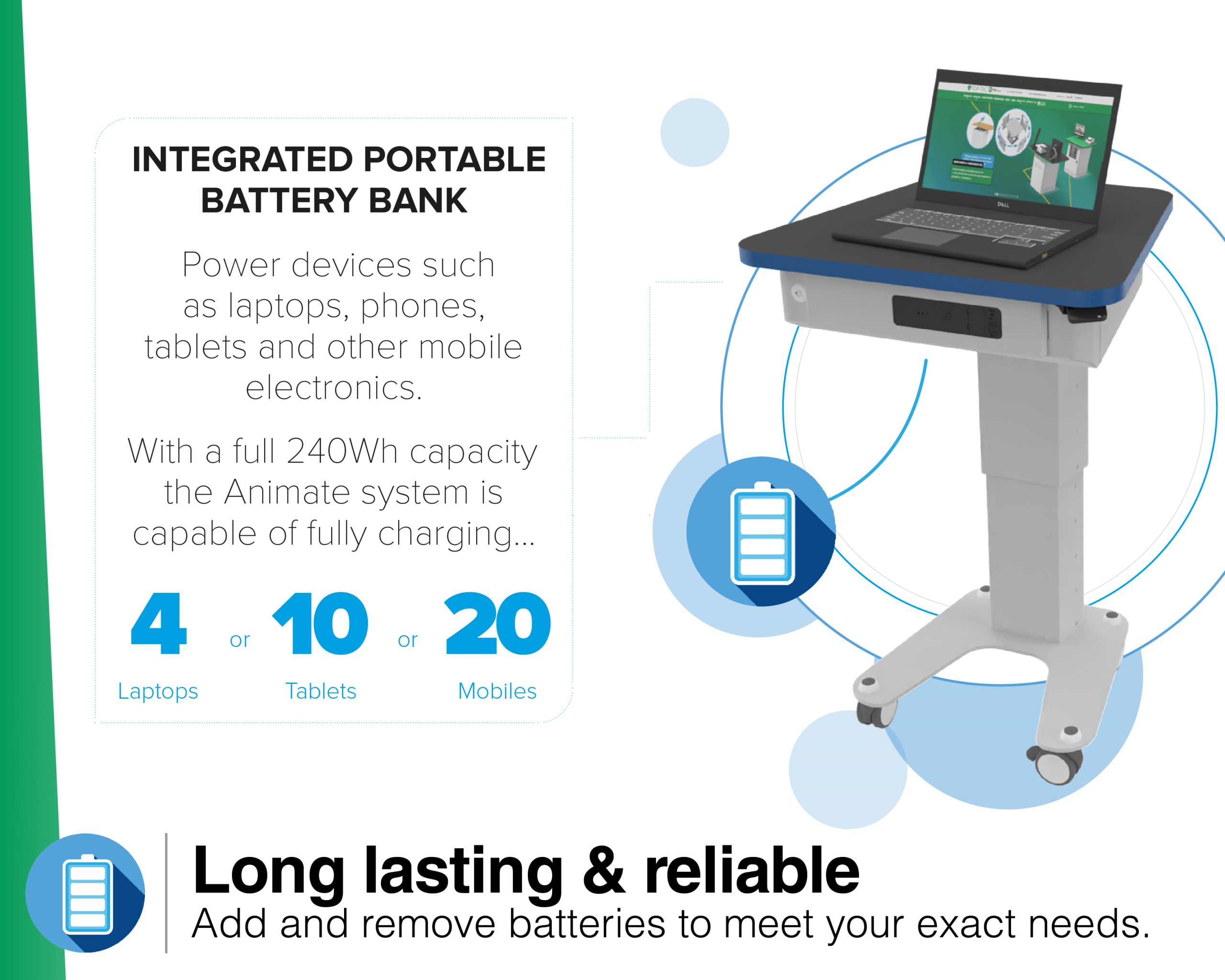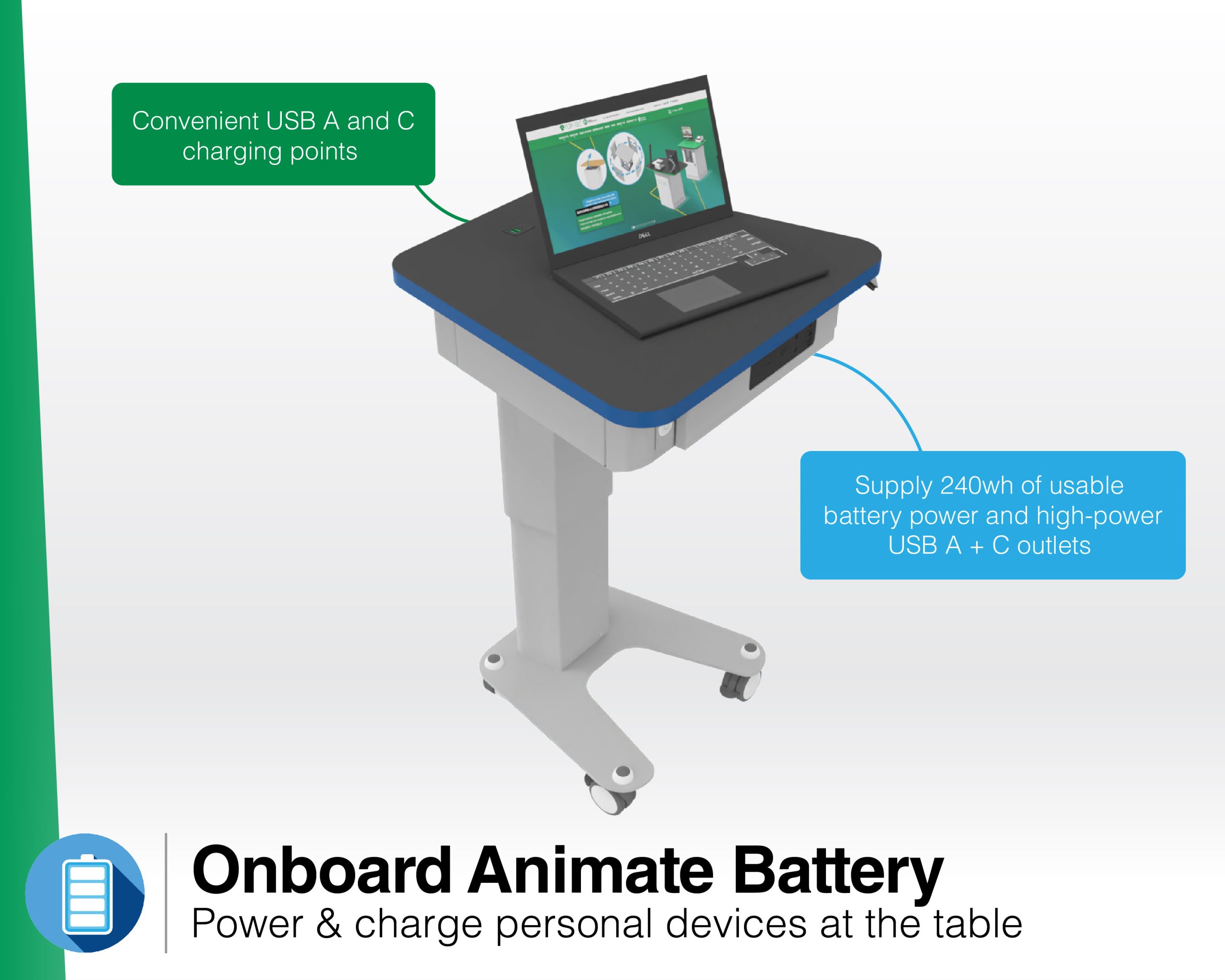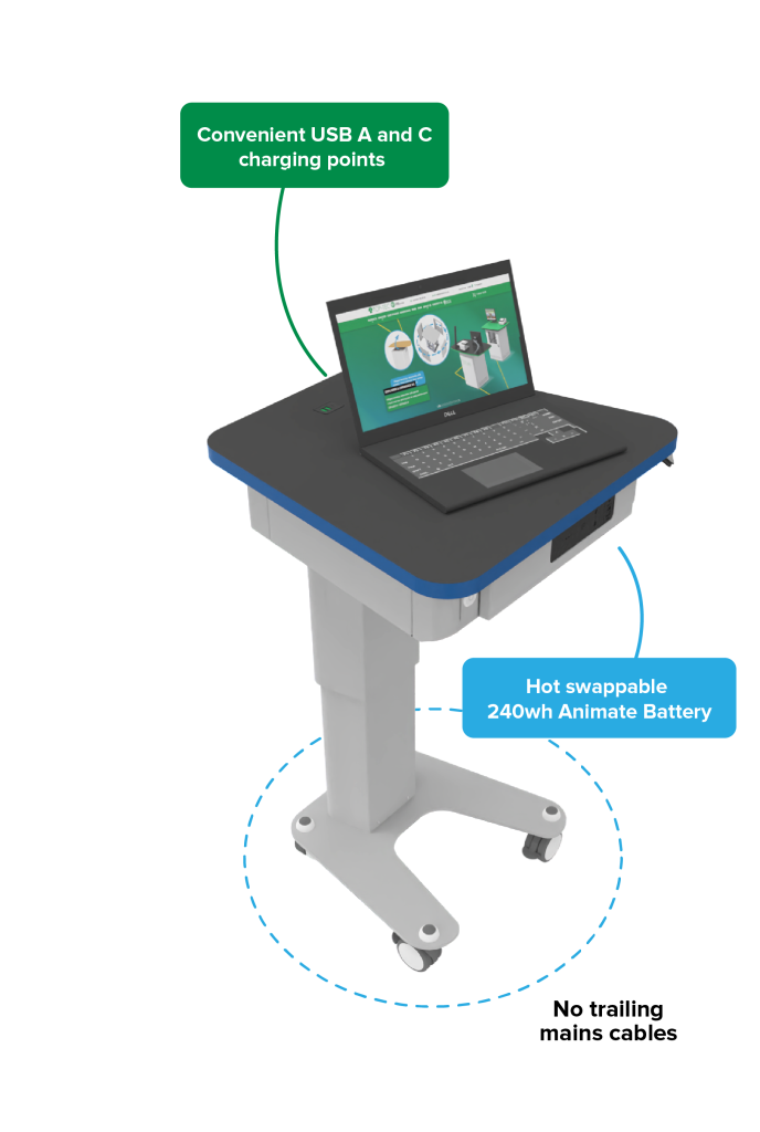 Orion features a portable Animate Battery for BYOD device charging anywhere, eliminating the safety risk from trailing mains cables. The battery can be hot-swapped with a fully charged battery pack and charged in a separate dock, allowing for continual use.