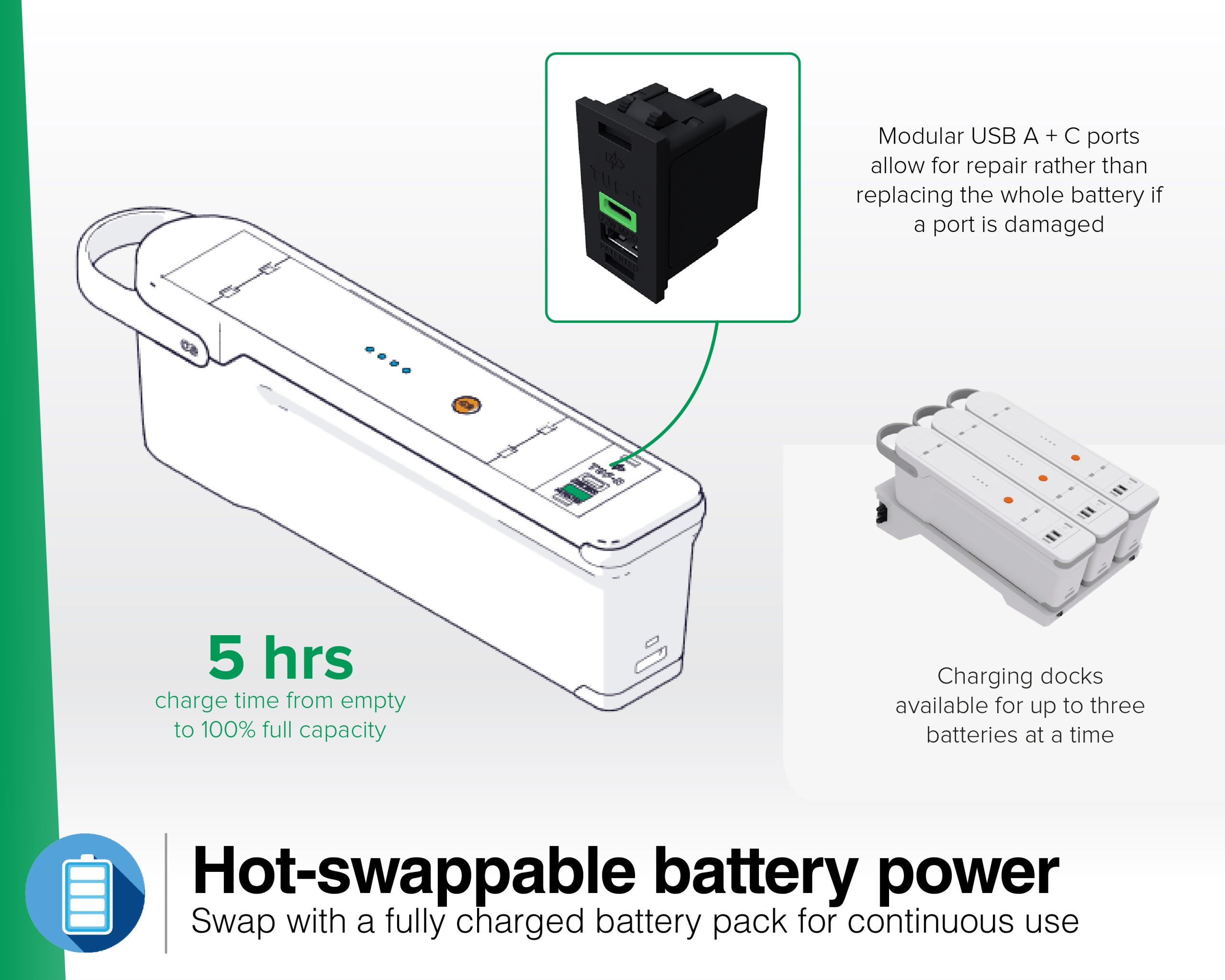 Hot swappable batteries Swap with a fully charged battery pack for continuous use. |