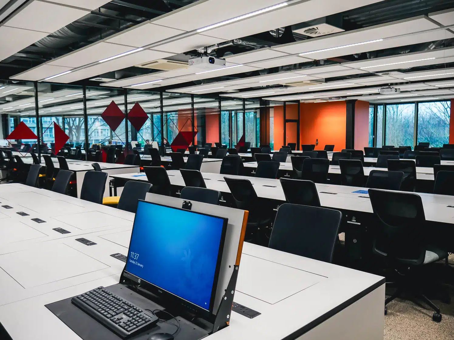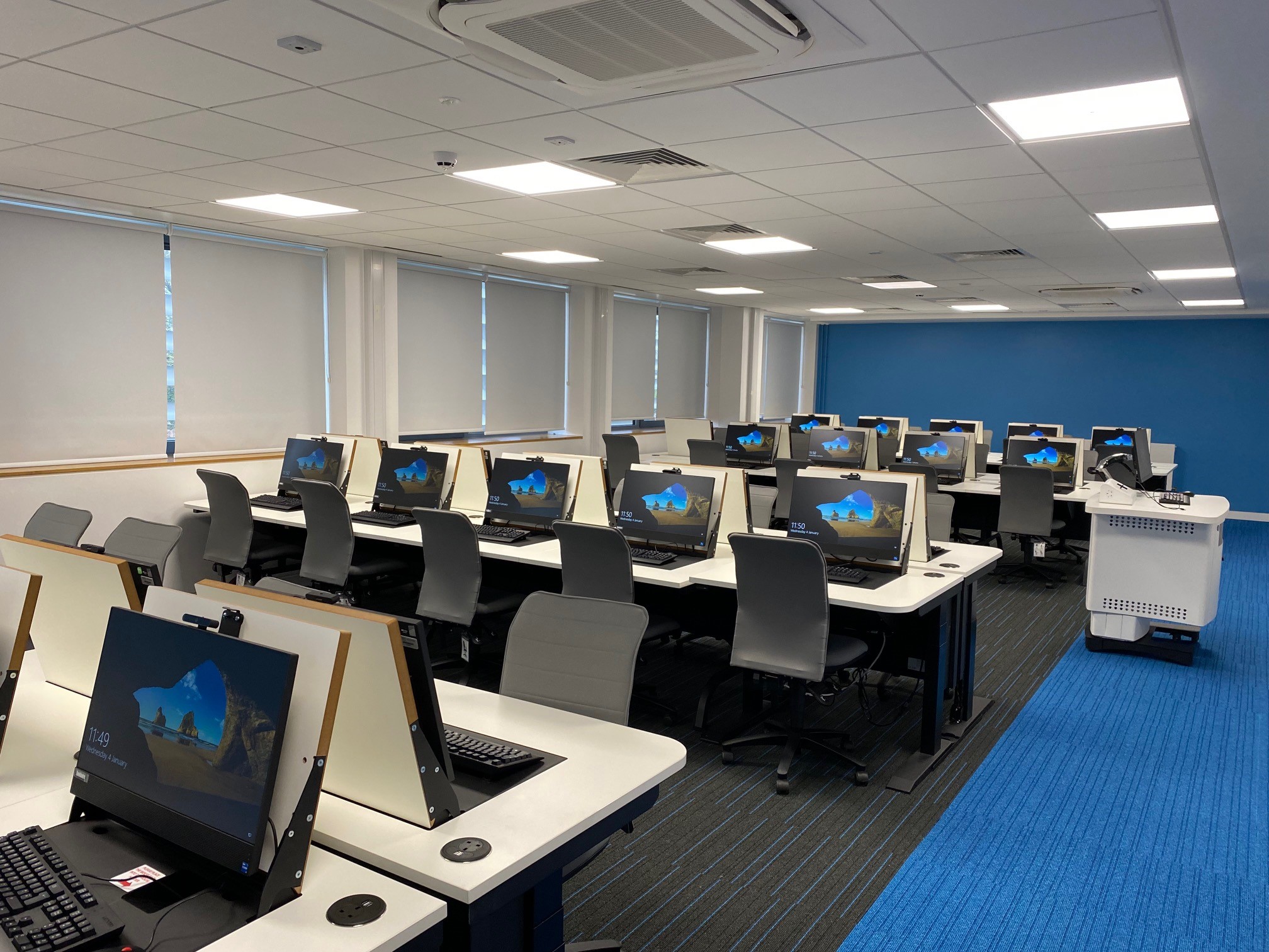Forum Desk offers both flexibility and security to any room installation. A discreet panel is built into the worktop to create a complete work surface, which reveals a screen, keyboard and mouse with the use of a lever. When out of use, all ICT equipment is hidden and stored in latched compartments.