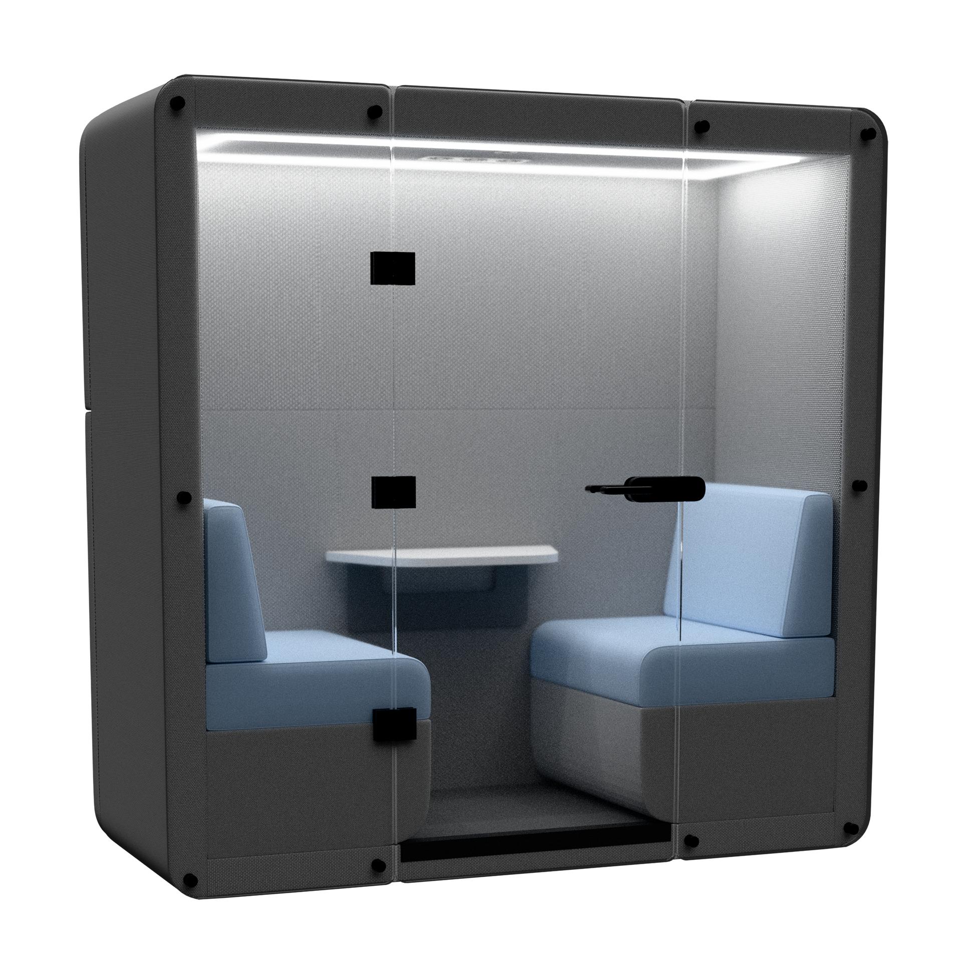 A 2 seat meeting Pod with roof, back wall and glass door.